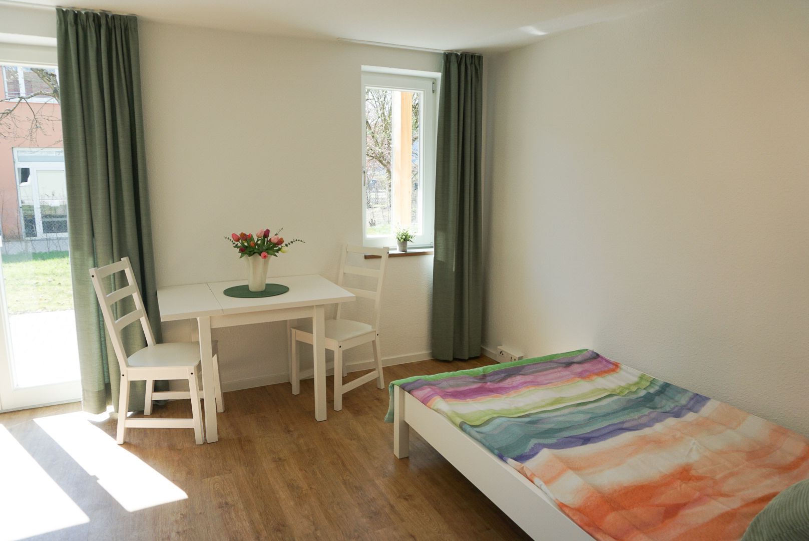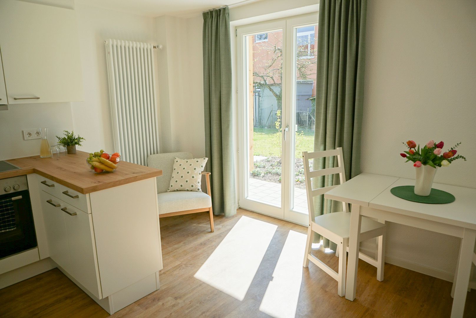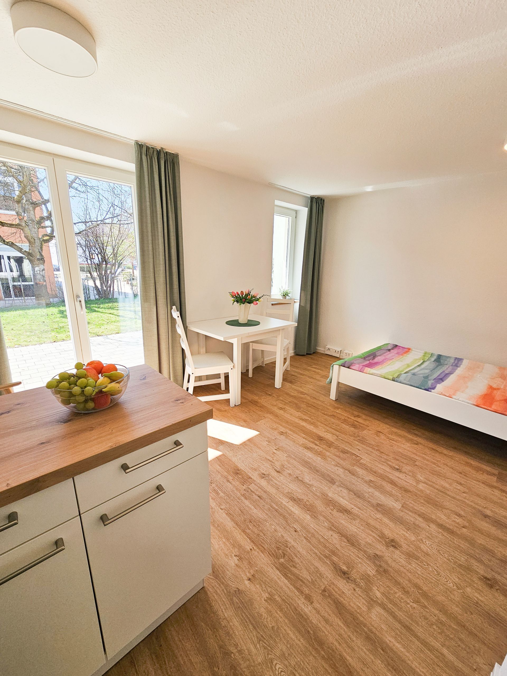 Alle Wohnungen sind teilmöbliert, verfügen über ein eigenes Bad mit Dusche, eine praktische Küchenzeile, einen Wohn- und Schlafbereich und bieten mit Balkon oder Terrasse zusätzlichen Wohnkomfort. Große Fenster sorgen für viel Tageslicht und eine angenehme Atmosphäre.